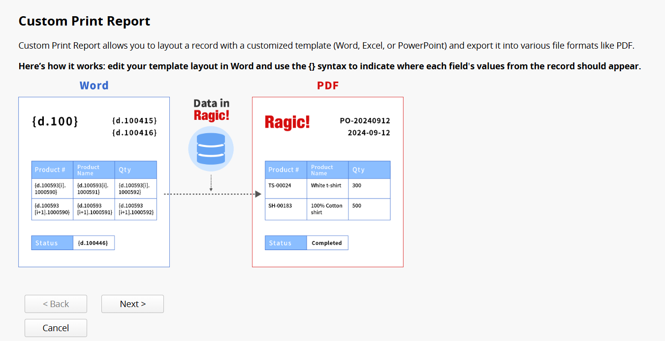 In Ragic, you can export records into custom formats, including PDF, DOCX, PNG, XLSX, and PPTX. For example, you can export "Sales Orders" into the PDF format your company commonly uses.