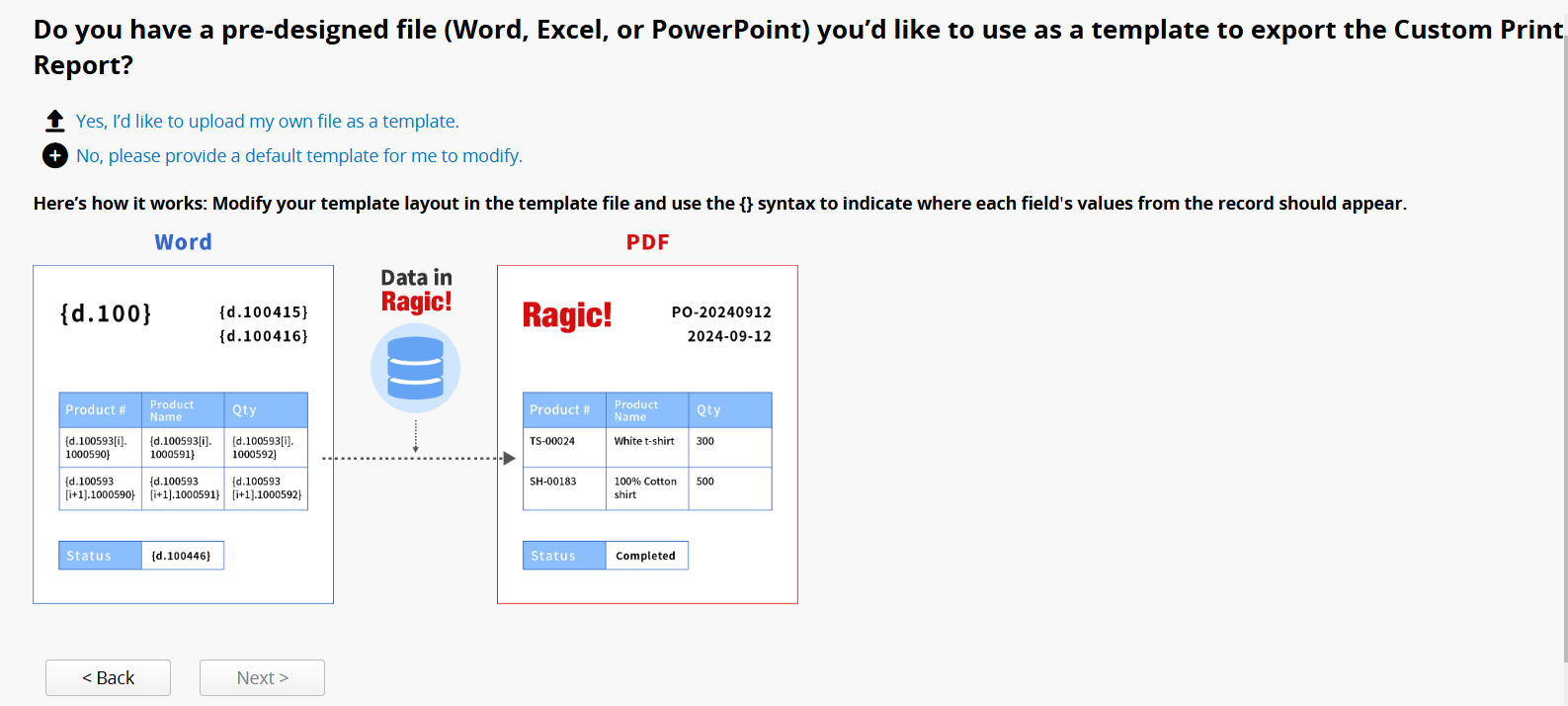 If you have a template, select Yes, I’d like to upload my own file as a template. If you don’t have one, select No, please provide a default template for me to modify.