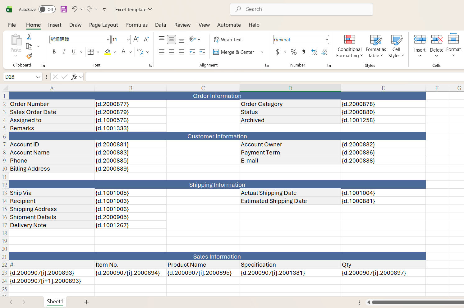 2. When a sheet has too many fields and the width is excessive, the downloaded template may not show fields that extend beyond the page. Please refer to the Field Value Syntax Reference to add fields to the template.